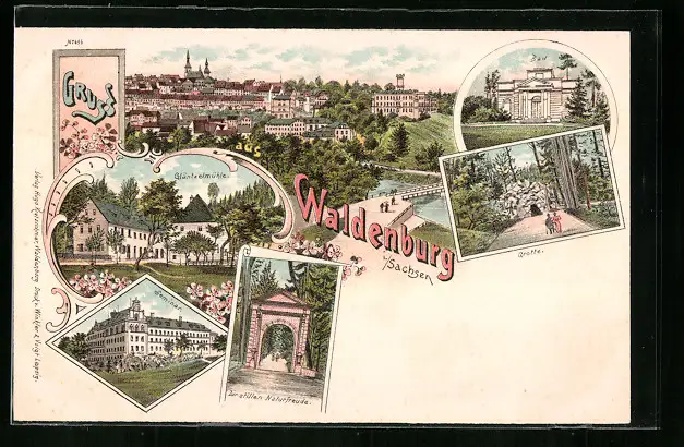 Lithographie Waldenburg i. Sachsen, Gläntzelmühle, Bad, Seminar