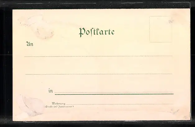 Personenbezogene Daten auf der Rückseite der Karte wurden durch blauen Textmarker unkenntlich gemacht. Die blauen Stellen sind auf die Vorderseite durchgeweicht und wirken sich negativ auf das Postkartenfoto aus