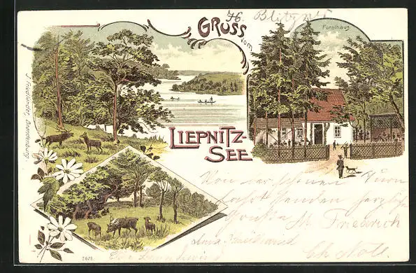 Lithographie Wandlitz, Forsthaus, Liepnitz-See, Hirsch und Rehe auf einer Wiese