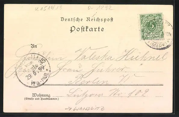 Personenbezogene Daten auf der Rückseite der Karte wurden durch blauen Textmarker unkenntlich gemacht. Die blauen Stellen sind auf die Vorderseite durchgeweicht und wirken sich negativ auf das Postkartenfoto aus