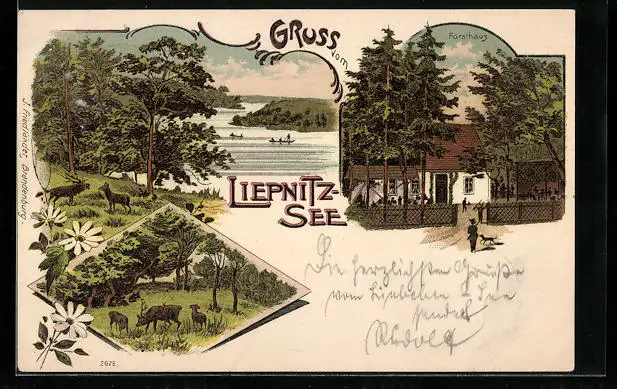 Lithographie Wandlitz, Gasthof Forsthaus am Liebnitzsee, Rotwild