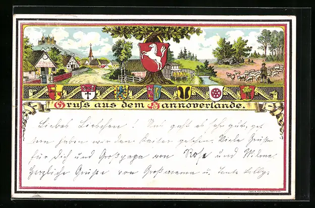 Lithographie Wappen, der Schäfer mit seiner Herde vor dem Ort