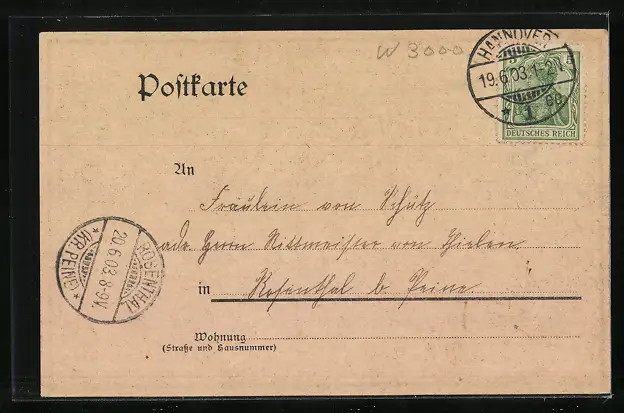 Personenbezogene Daten auf der Rückseite der Karte wurden durch blauen Textmarker unkenntlich gemacht. Die blauen Stellen sind auf die Vorderseite durchgeweicht und wirken sich negativ auf das Postkartenfoto aus