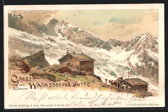 Lithographie Warnsdorfer Hütte, Berghütte mit Gebirgspanorama