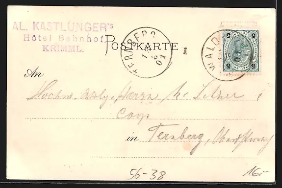 Personenbezogene Daten auf der Rückseite der Karte wurden durch blauen Textmarker unkenntlich gemacht. Die blauen Stellen sind auf die Vorderseite durchgeweicht und wirken sich negativ auf das Postkartenfoto aus