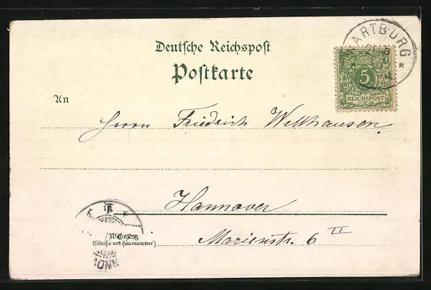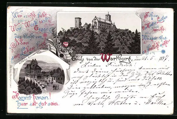 Lithographie Wartburg, Aussenansicht, Passanten wandern zur Restauration