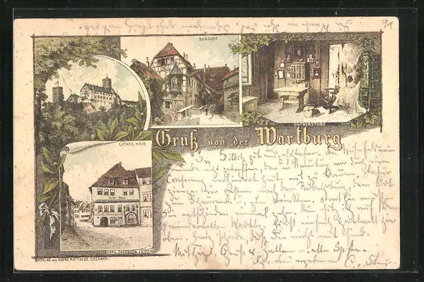 Lithographie Wartburg, Gesamtansicht, Burghof, Lutherstube