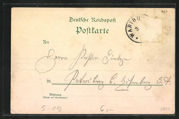 Personenbezogene Daten auf der Rückseite der Karte wurden durch blauen Textmarker unkenntlich gemacht. Die blauen Stellen sind auf die Vorderseite durchgeweicht und wirken sich negativ auf das Postkartenfoto aus