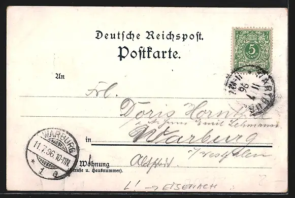 Personenbezogene Daten auf der Rückseite der Karte wurden durch blauen Textmarker unkenntlich gemacht. Die blauen Stellen sind auf die Vorderseite durchgeweicht und wirken sich negativ auf das Postkartenfoto aus