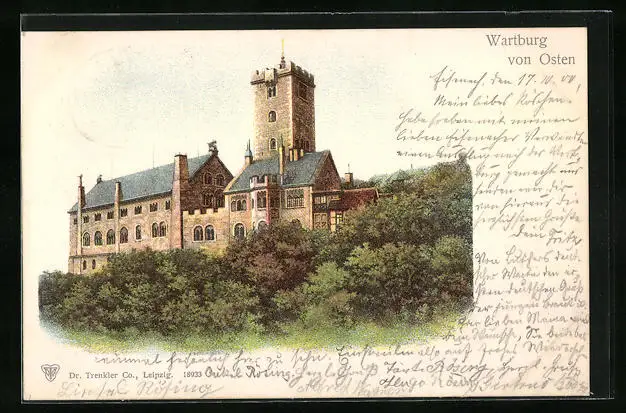 Personenbezogene Daten auf der Rückseite der Karte wurden durch blauen Textmarker unkenntlich gemacht. Die blauen Stellen sind auf die Vorderseite durchgeweicht und wirken sich negativ auf das Postkartenfoto aus