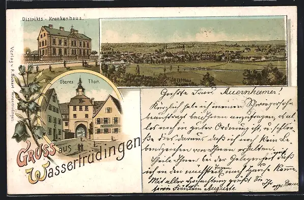 Lithographie Wassertrüdingen, Distrikts-Krankenhaus, Oberes Tor, Panorama