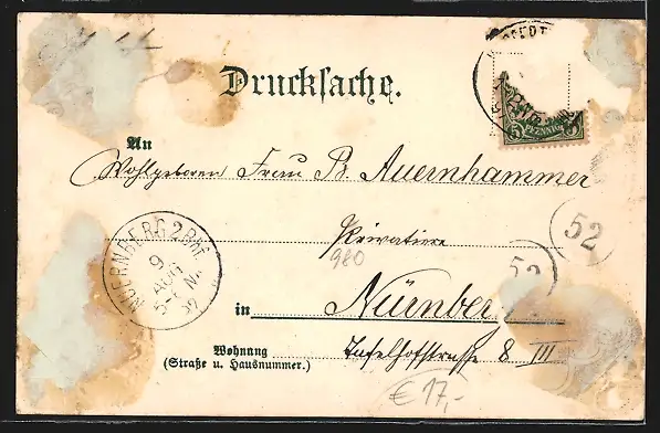 gelaufen, Briefmarke entfernt, rückseitig Klebe- und Papierreste, guter Zustand