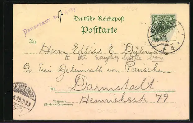 Personenbezogene Daten auf der Rückseite der Karte wurden durch blauen Textmarker unkenntlich gemacht. Die blauen Stellen sind auf die Vorderseite durchgeweicht und wirken sich negativ auf das Postkartenfoto aus