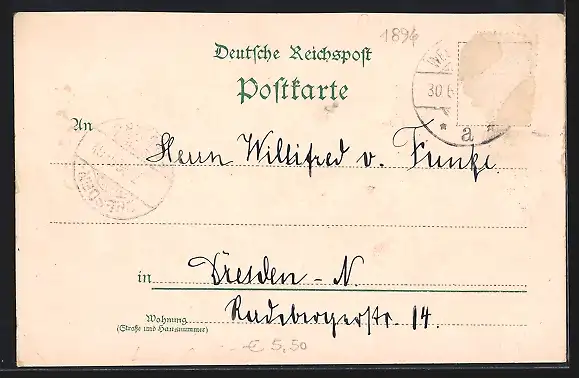 Personenbezogene Daten auf der Rückseite der Karte wurden durch blauen Textmarker unkenntlich gemacht. Die blauen Stellen sind auf die Vorderseite durchgeweicht und wirken sich negativ auf das Postkartenfoto aus