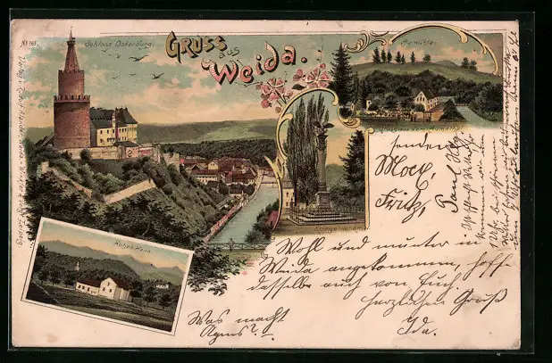Lithographie Weida, Teilansicht mit Schloss, Hohes Haus, Aumühle