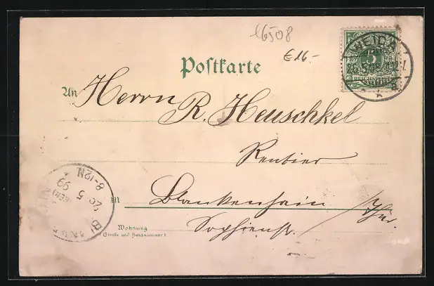 Personenbezogene Daten auf der Rückseite der Karte wurden durch blauen Textmarker unkenntlich gemacht. Die blauen Stellen sind auf die Vorderseite durchgeweicht und wirken sich negativ auf das Postkartenfoto aus