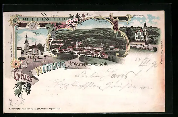 Lithographie Weidling b. Klosterneuburg, Teilansicht, Marienburg, Kirche