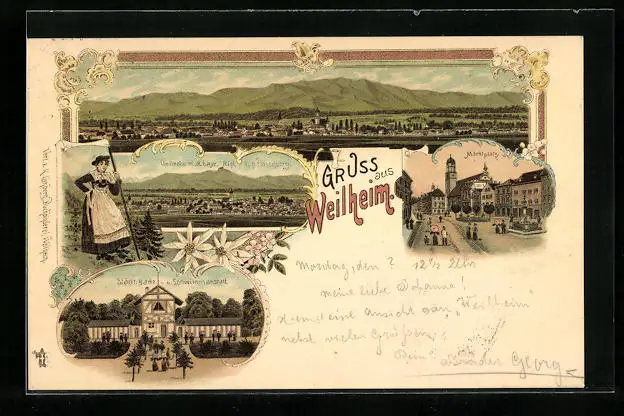 Lithographie Weilheim, Marienplatz, Städt. Bade- u. Schwimmanstalt