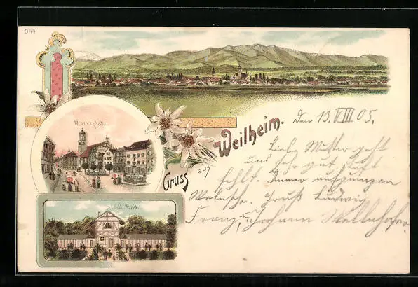 Lithographie Weilheim, Ortspanorama, Marktplatz und Städtisches Bad