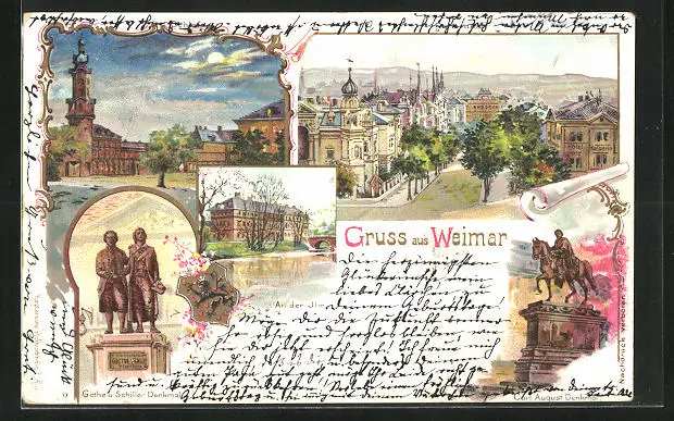 Lithographie Weimar, Carl August Denkmal, An der Ilm. Göthe und Schiller Denkmal