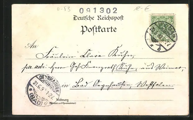 Personenbezogene Daten auf der Rückseite der Karte wurden durch blauen Textmarker unkenntlich gemacht. Die blauen Stellen sind auf die Vorderseite durchgeweicht und wirken sich negativ auf das Postkartenfoto aus