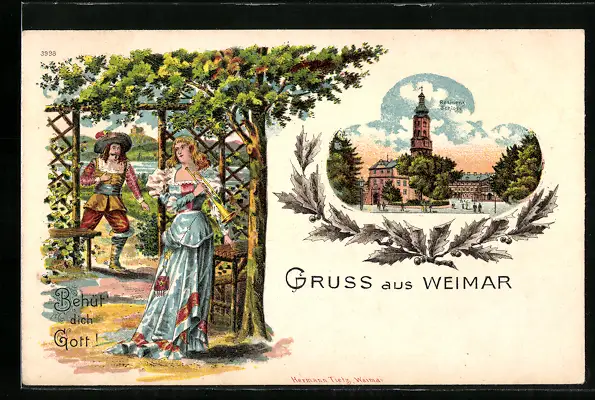 Lithographie Weimar, Residenz-Schloss, Behüt` dich Gott