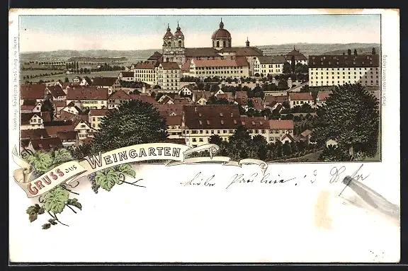 Lithographie Weingarten, Ortsansicht über die Dächer mit Bergen