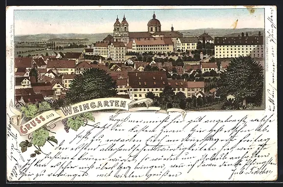 Lithographie Weingarten, Ortsansicht über die Dächer mit Bergen