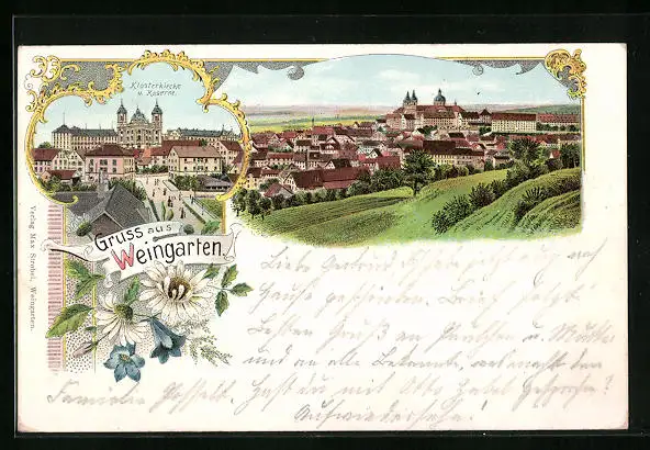Lithographie Weingarten, Totalansicht mit Klosterkirche und Kaserne
