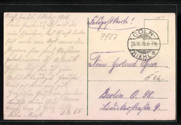Personenbezogene Daten auf der Rückseite der Karte wurden durch blauen Textmarker unkenntlich gemacht. Die blauen Stellen sind auf die Vorderseite durchgeweicht und wirken sich negativ auf das Postkartenfoto aus