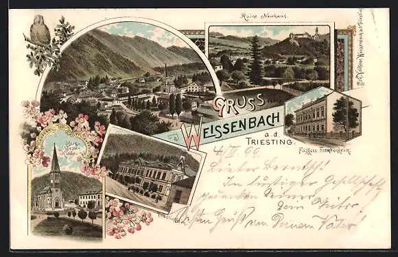 Lithographie Weissenbach a.d. Triesting, Fuggers Fremdenheim, Triestingheim, Herz-Jesu-Kirche, Ruine Neuhaus