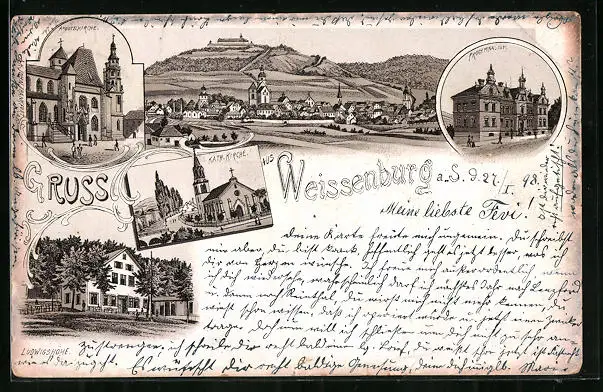 Lithographie Weissenburg a. S., Apostelkirche, Kath. Kirche, Ludwigshöhe, Progymnasium, Totalansicht