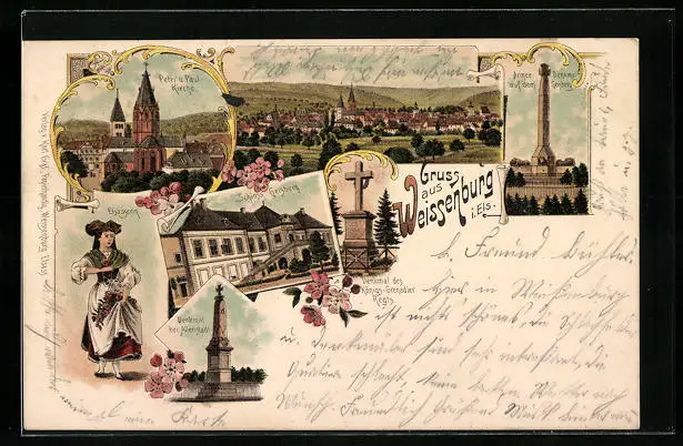 Lithographie Weissenburg i. Els., Schloss Geisberg, Peter und Paul Kirche, Denkmäler