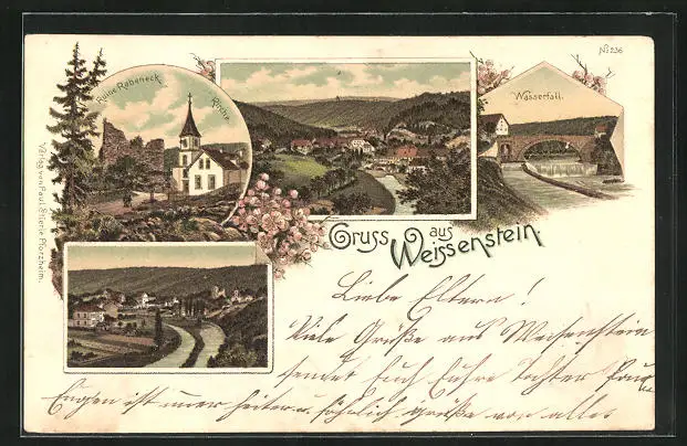 Lithographie Weissenstein, Ruine Rabeneck, Wasserfall, Totalansicht