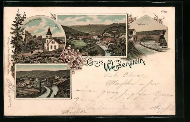 Lithographie Weissenstein, Ruine Rabeneck, Wasserfall und Totalansicht