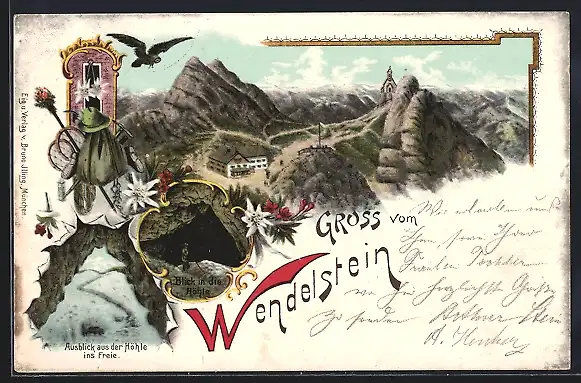 Lithographie Wendelstein, Blick auf Gebirge mit Höhle