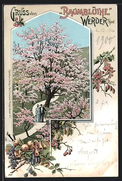 Lithographie Werder a. Havel, Spaziergänger zur Zeit der Baumblüthe