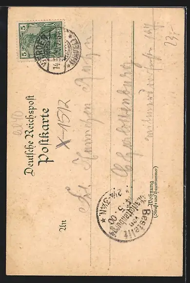 Personenbezogene Daten auf der Rückseite der Karte wurden durch blauen Textmarker unkenntlich gemacht. Die blauen Stellen sind auf die Vorderseite durchgeweicht und wirken sich negativ auf das Postkartenfoto aus