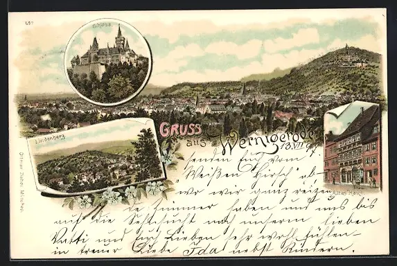 Lithographie Wernigerode, Lindenberg, Schloss, Altes Haus