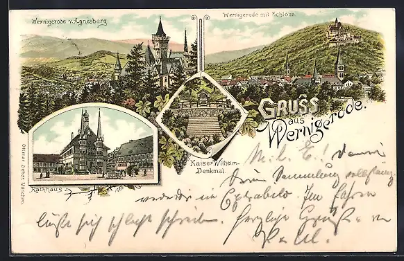 Lithographie Wernigerode, Rathaus, Kaiser Wilhelm Denkmal, Schloss