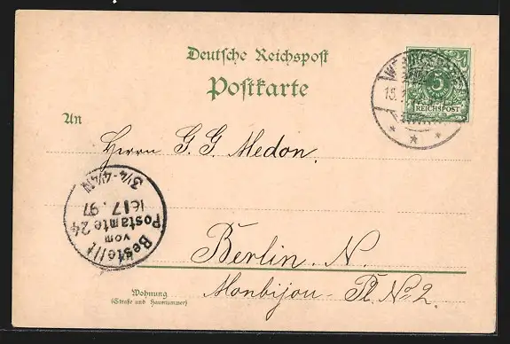 Personenbezogene Daten auf der Rückseite der Karte wurden durch blauen Textmarker unkenntlich gemacht. Die blauen Stellen sind auf die Vorderseite durchgeweicht und wirken sich negativ auf das Postkartenfoto aus