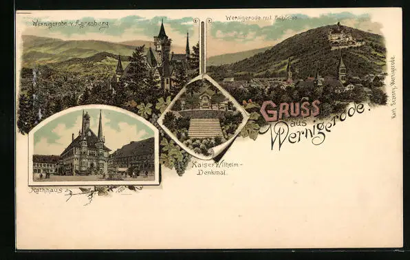Lithographie Wernigerode, Totalansicht mit Rathaus und Kaiser Wilhelm-Denkmal