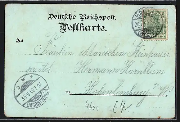 gelaufen 1904, Stempelspur, Eckknicke re. und li. oben, Kantenschaden li. unten, guter Zustand