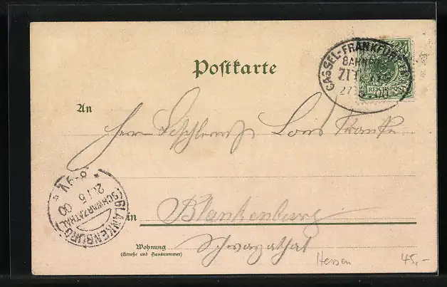 Personenbezogene Daten auf der Rückseite der Karte wurden durch blauen Textmarker unkenntlich gemacht. Die blauen Stellen sind auf die Vorderseite durchgeweicht und wirken sich negativ auf das Postkartenfoto aus