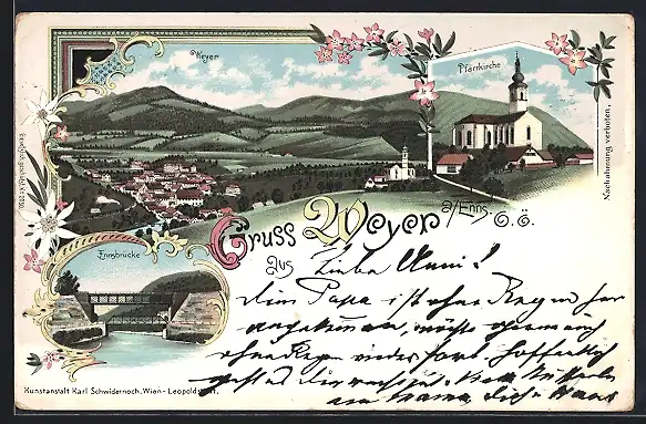Lithographie Weyer a. Enns, Ortsansicht, Pfarrkirche und Ennsbrücke