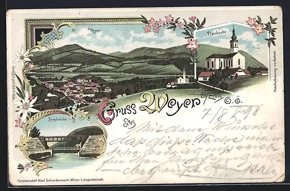 Lithographie Weyer a. Enns, Partie an der Ennsbrücke, Pfarrkirche