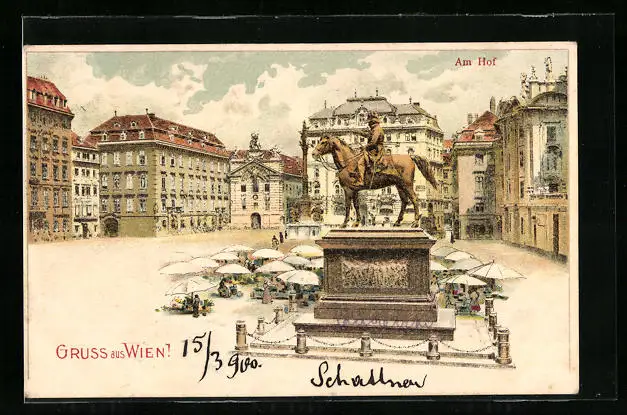 Lithographie Wien, Am Hof, Denkmal, Markttag