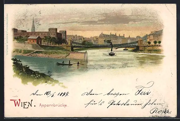 Lithographie Wien, Aspernbrücke, Dampfer
