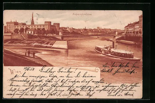 Lithographie Wien, Aspernbrücke mit Dampfer