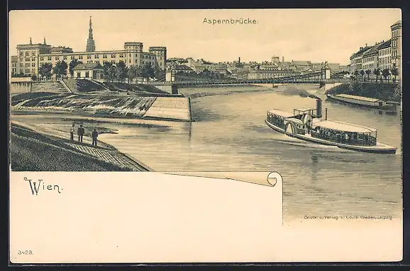 Lithographie Wien, Aspernbrücke mit Dampfer